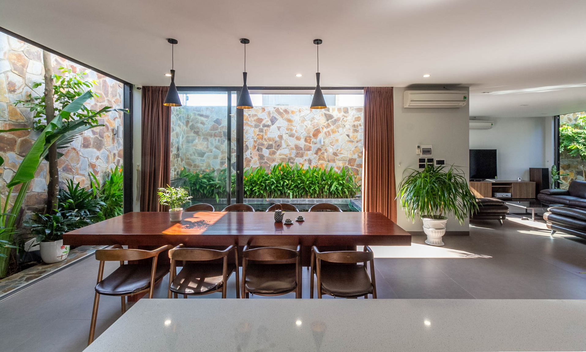 Tầng 1 là các không gian chung – khách, ăn, bếp. Tầng 2 là các phòng riêng. Tầng 3 là các không gian thư giãn, phòng thờ và vườn mái để tận hưởng cảnh quan thành phố.